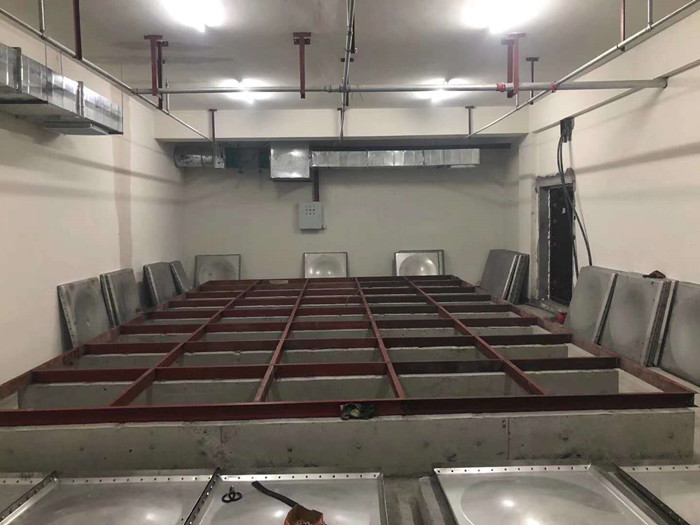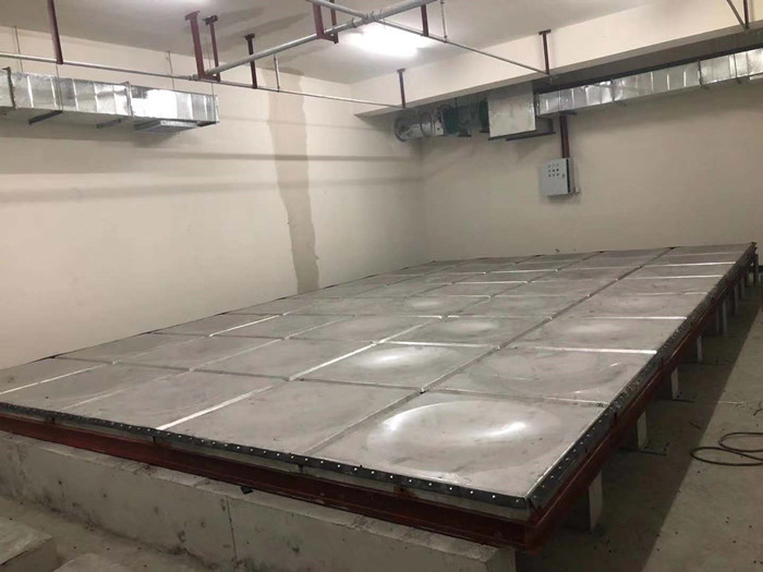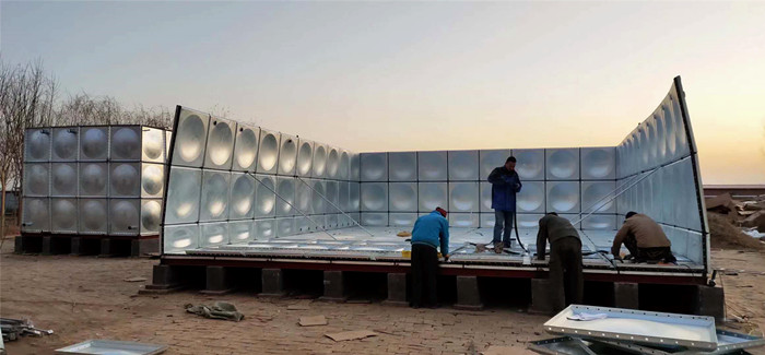 2.安裝水箱,在水箱板安裝之前,同樣按照發(fā)貨清單依次清點,底板,側(cè)板及蓋板的數(shù)量及打孔是否正確。開始組裝底板,把板依次擺好,板與板中間夾好橡膠條,穿上螺栓,用電動扳手吧螺絲緊固好,把底板連接起來,放在焊好的槽鋼底座上。