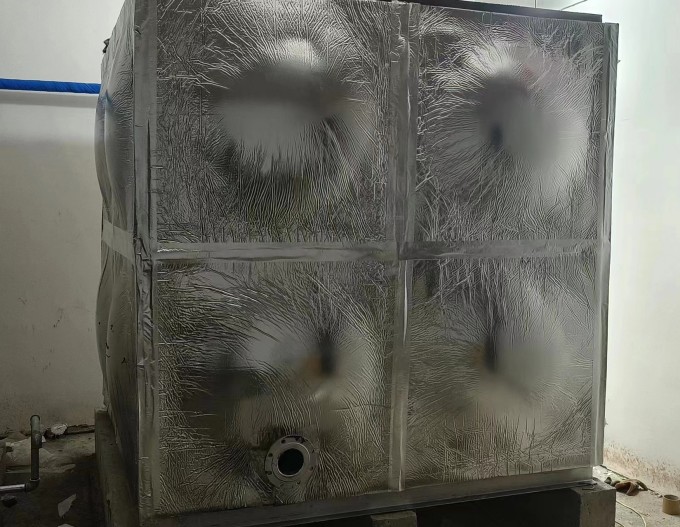 我廠承接的山東省煙臺市萊山區臺?,斉瑺栐O備有限公司一臺樓頂消防水箱一臺地下室飲用水箱經過三天時間已經安裝試水完成。水箱安裝在室內,采用的是橡塑鋁箔布保溫。水箱安裝現場圖如下: